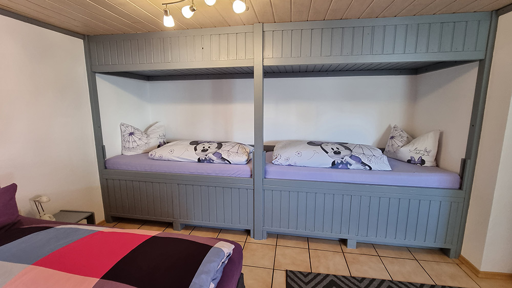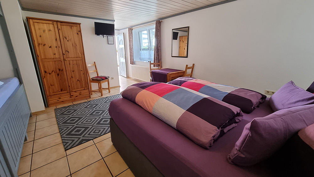 Unser gemütlich eingerichtetes 4-Bett-Zimmer mit bequemen Ehebett sowie zwei (auch kindergerechten) zusätzlichen Betten verfügt über ein eigenes Bad mit Dusche und WC und ist darüber hinaus noch mit TV, Klimaanlage und kostenlosen WLAN ausgestattet. Ihnen stehen selbstverständlich auch alle weiteren Annehmlichkeiten unseres Hauses, wie freier Parkplatz, Aufenthaltsraum mit Billardtisch, großzügige Gartenanlage mit Pool, Getränke (gegen Aufpreis) sowie unsere Terrasse zur Verfügung. Am Morgen erwarten wir Sie mit einem leckeren Frühstückbuffet und frischen Kaffee in unserem Frühstücksraum (bei allen Zimmern inkl.)