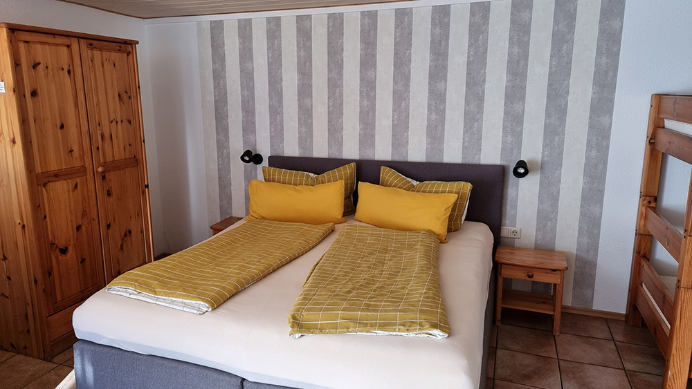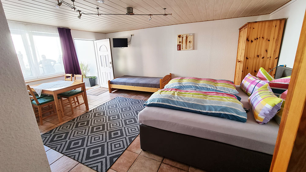 Unser 5-Bett-Zimmer bietet genug Platz für Ihren Aufenthalt mit der ganzen Familie und verfügt über ein eigenes Bad mit Dusche und WC und ist darüber hinaus noch mit TV, Klimaanlage und kostenlosen WLAN ausgestattet. Ihnen stehen selbstverständlich auch alle weiteren Annehmlichkeiten unseres Hauses, wie freier Parkplatz, Aufenthaltsraum mit Billardtisch, großzügige Gartenanlage mit Pool, Getränke (gegen Aufpreis) sowie unsere Terrasse zur Verfügung. Am Morgen erwarten wir Sie mit einem leckeren Frühstückbuffet und frischen Kaffee in unserem Frühstücksraum (bei allen Zimmern inkl.)