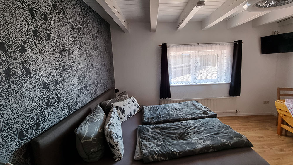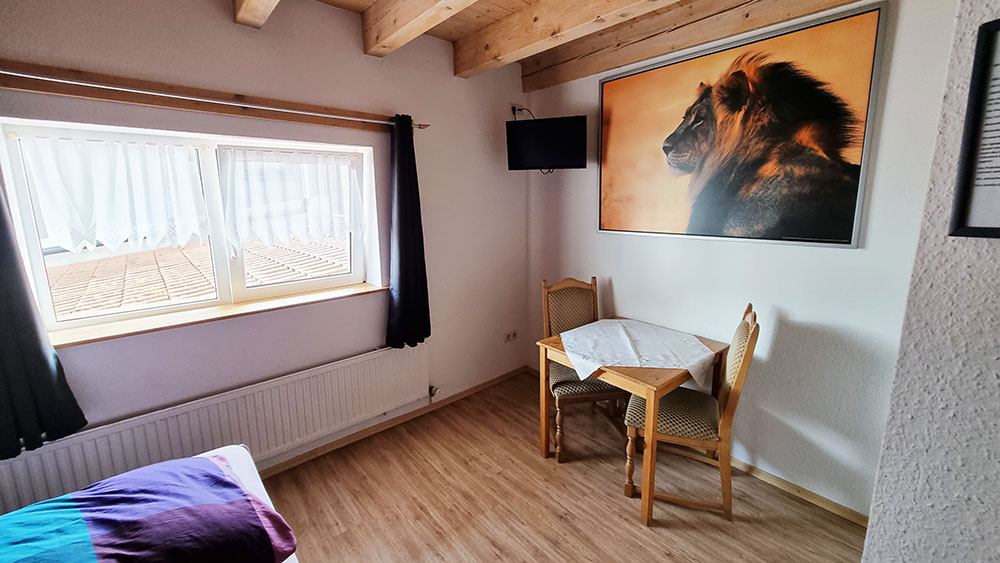 Unser gemütlich eingerichtetes Doppelzimmer mit bequemen Boxspringbett verfügt über ein eigenes Bad mit Dusche und WC und ist darüber hinaus noch mit TV, Klimaanlage und kostenlosen WLAN ausgestattet. Ihnen stehen selbstverständlich auch alle weiteren Annehmlichkeiten unseres Hauses, wie freier Parkplatz, Aufenthaltsraum mit Billardtisch, großzügige Gartenanlage mit Pool, Getränke (gegen Aufpreis) sowie unsere Terrasse zur Verfügung. Am Morgen erwarten wir Sie mit einem leckeren Frühstückbuffet und frischen Kaffee in unserem Frühstücksraum (bei allen Zimmern inkl.)